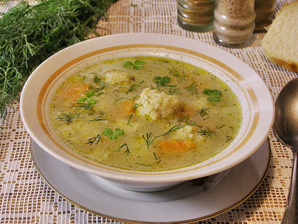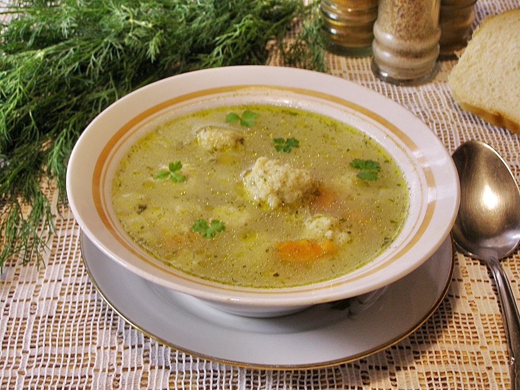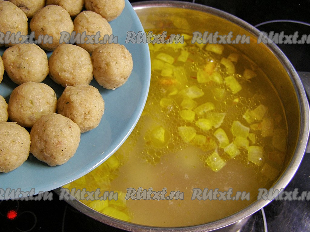 Сразу же выкладываем в кастрюлю рыбные фрикадельки, даём супу закипеть, а затем варим его на умеренном огне минут 7, если нужно, досаливаем.