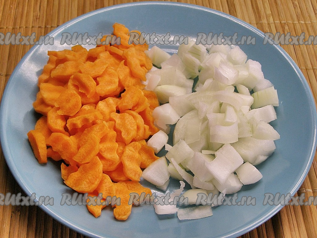 Оставшуюся луковицу очищаем, нарезаем на небольшие кубики. Морковь очищаем и нарезаем её на достаточно тонкие полукружочки (или натираем на крупной тёрке).
