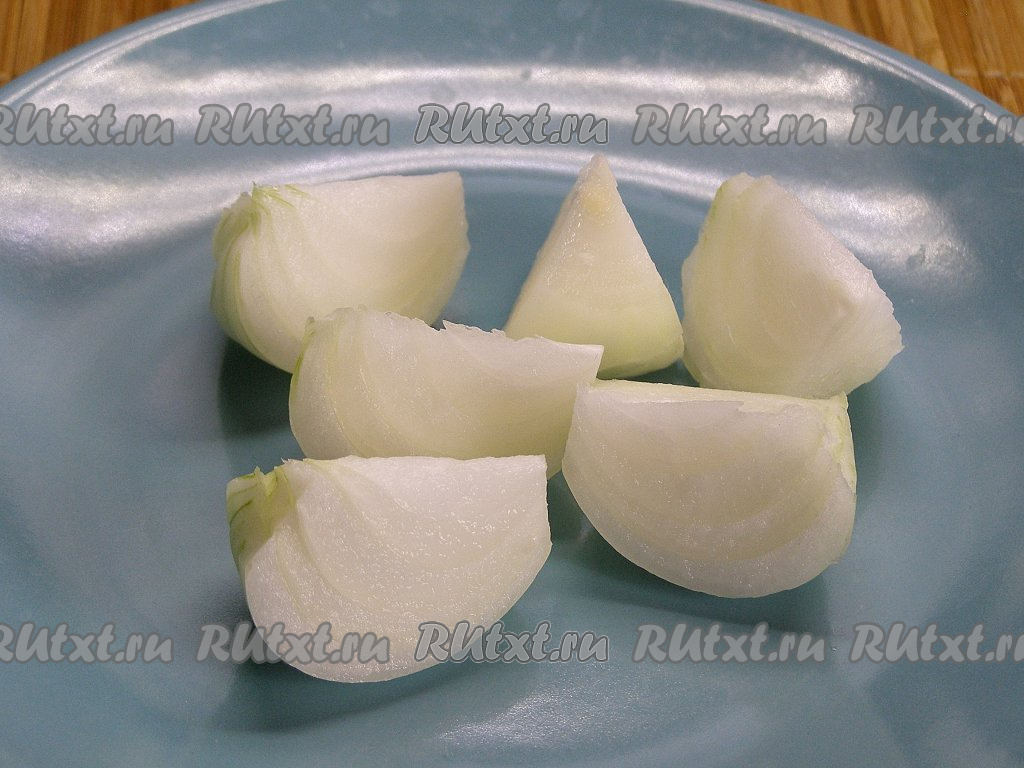 Одну луковицу очищаем от шелухи и разрезаем на несколько частей так, чтобы кусочки лука поместились в мясорубку.