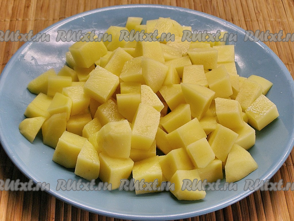 Картофель моем, очищаем от кожуры и нарезаем на кубики среднего размера.