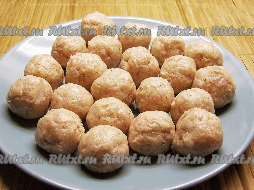 Из получившегося рыбного фарша формируем круглые фрикадельки размером чуть меньше грецкого ореха. Убираем фрикадельки на время, пока будут вариться рис с картошкой, в холодильник.