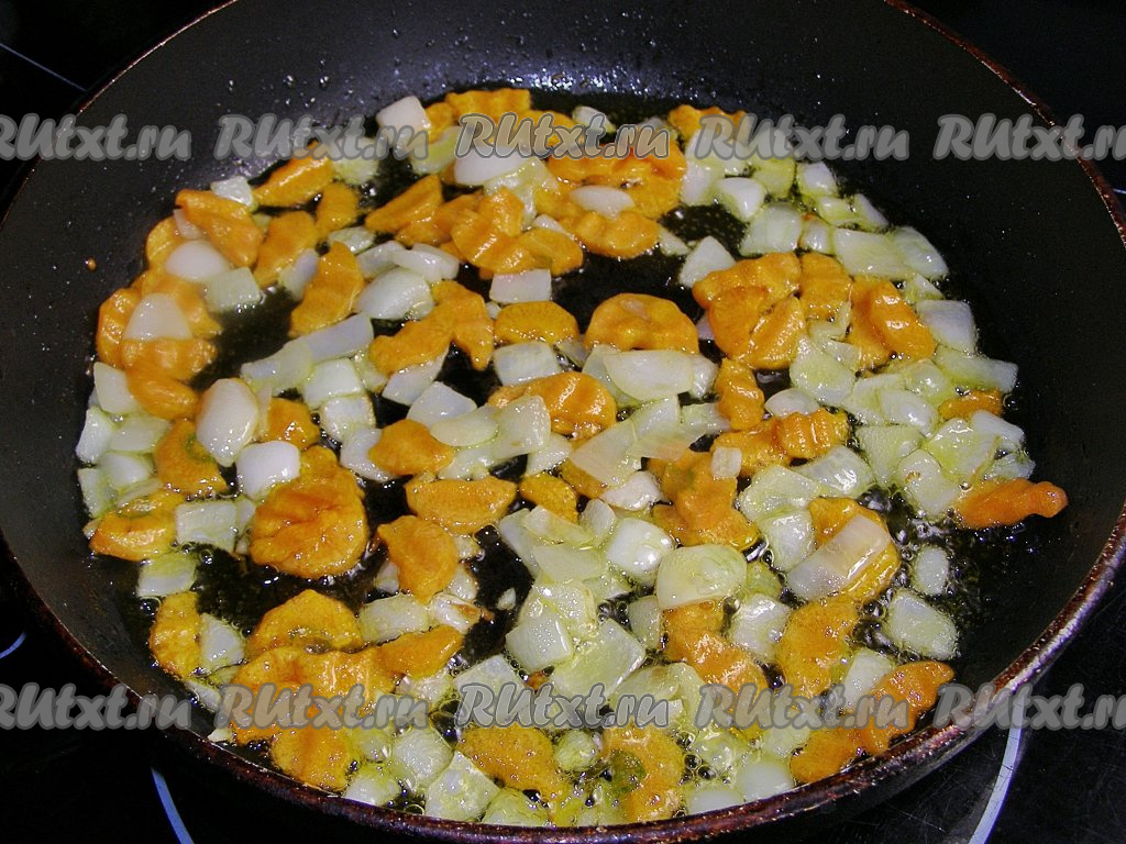 Пока рис с картошкой варятся, в сковороду с подсолнечным маслом выкладываем лук с морковкой, обжариваем овощи, помешивая, на среднем огне до размягчения моркови и полупрозрачности лука (на это потребуется 5-6 минут), затем убираем с огня.