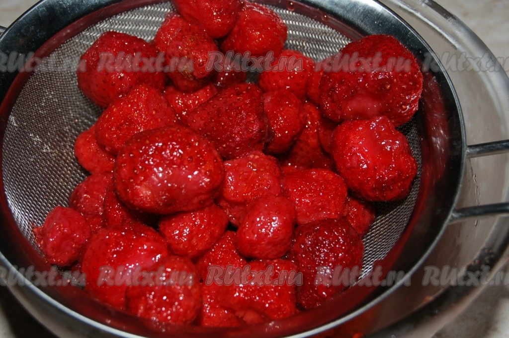Приготовить клубнику. Положить ее в миску и засыпать сахаром (2 столовыми ложками) на 30 минут. Это делается для того, чтобы клубника стала более сочной. Затем переложить ее в сито, чтобы стекла лишняя жидкость. Я использовала клубнику, которая была в сахарном сиропе несколько дней.