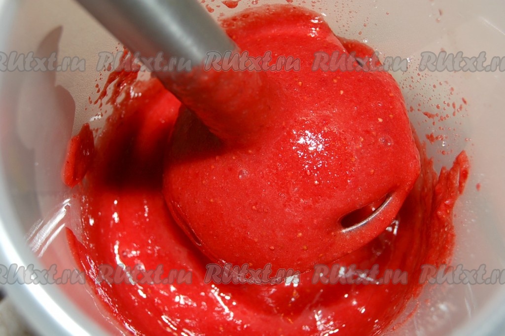 Переложить клубнику в миску, добавить к ней сахар ( 1/4 стакана), кукурузный крахмал и взбить погружным блендером до пюреобразного состояния.
