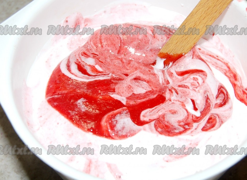 Во взбитые белки переложить клубничную массу. Перекладывать в несколько заходов, аккуратно помешивая силиконовой лопаточкой.