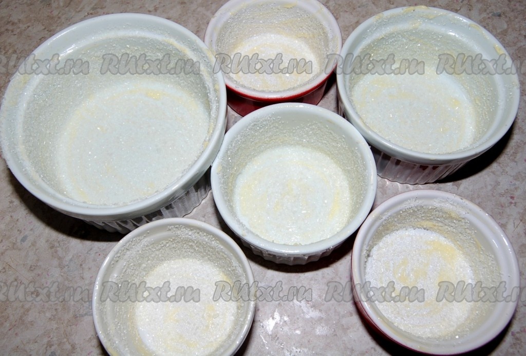 Приготовить огнеупорные формочки для суфле. Для этого каждую формочку изнутри смазать сливочным маслом и обсыпать сахарным песком. Излишки сахара стряхнуть.