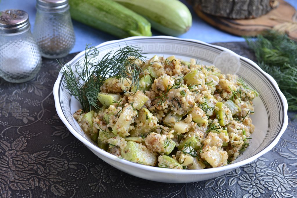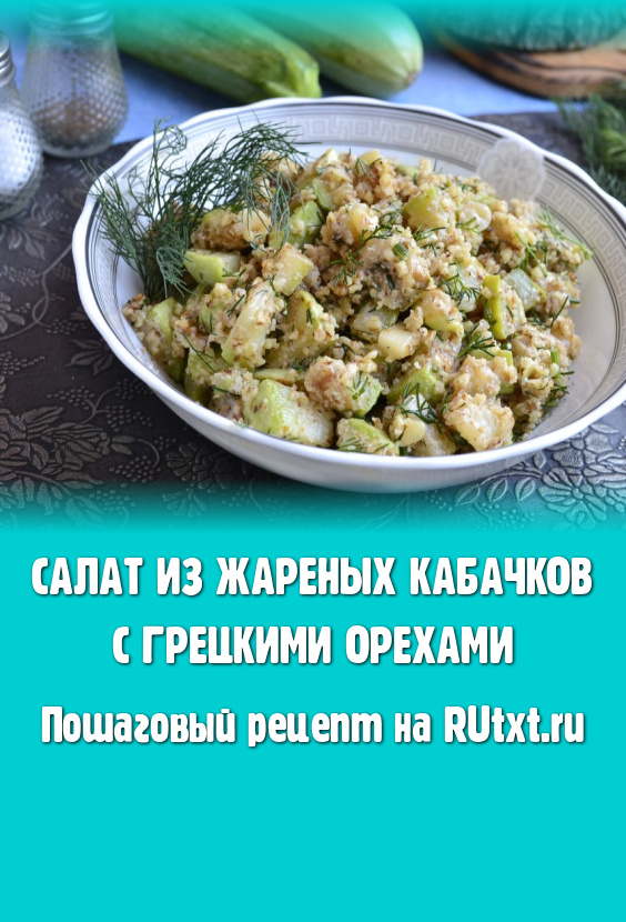 Вкуснейший салат, приготовленный из жареных кабачков с грецкими орехами, можно есть как в тёплом, так и в остывшем виде.