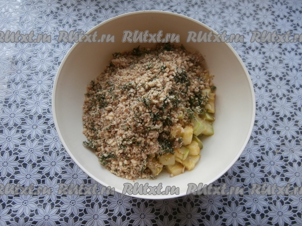 Горячие обжаренные кабачки выложить в салатник, добавить к ним смесь из измельчённых грецких орехов, чеснока и зелени, посолить по вкусу.