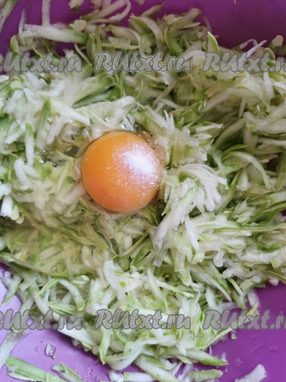 К кабачковой массе добавить яйцо, соль и тщательно перемешать.