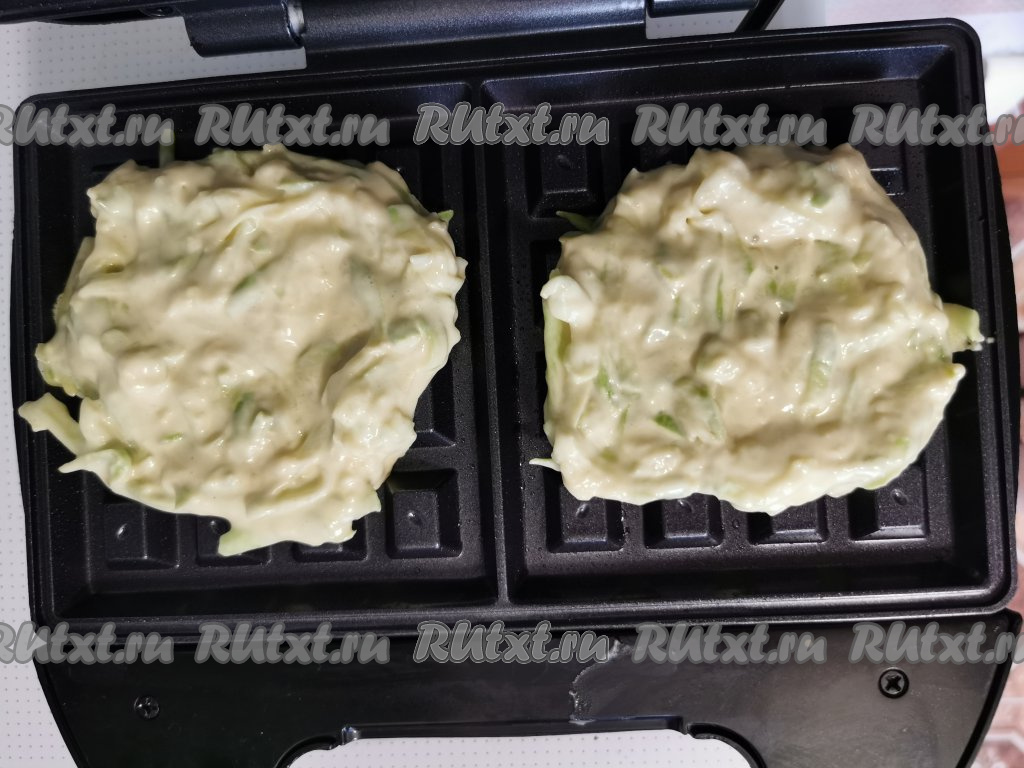 Смазать панели электровафельницы растительным маслом и разогреть. Выкладывать на каждую панель электровафельницы 1,5 столовых ложки кабачкового теста, закрыть крышку и выпекать вафли до румяности (примерно 5 минут).