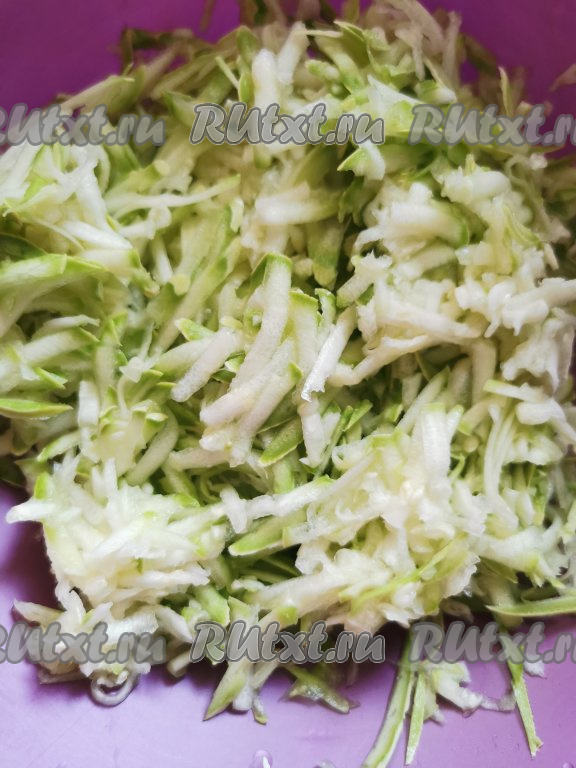 Вымыть кабачок, а затем натереть его на крупной тёрке (если кабачок молодой, можно кожуру с него не срезать). Отжать кабачок от лишней жидкости, выделившуюся жидкость слить (она нам не понадобится).