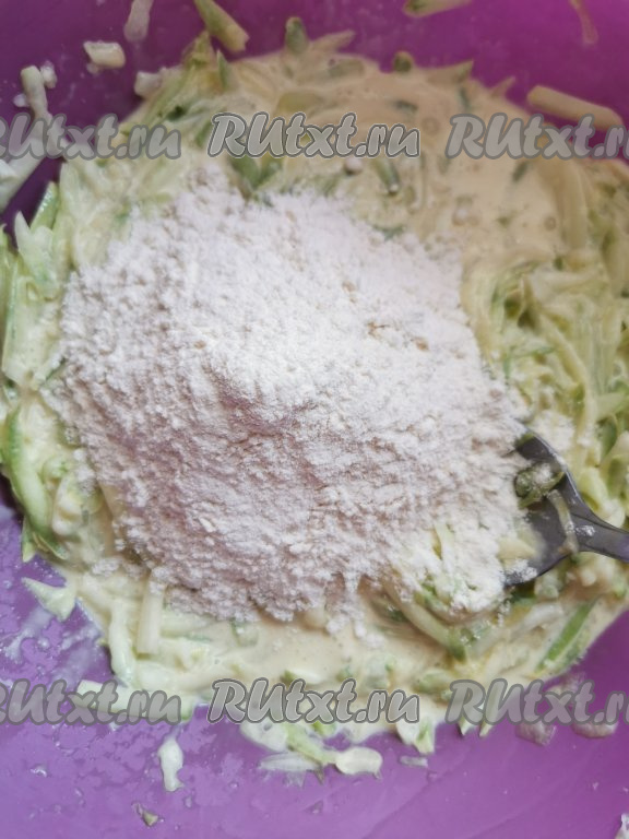 Частями всыпать просеянную муку, тщательно перемешивая кабачковое тесто ложкой после добавления каждой порции теста.