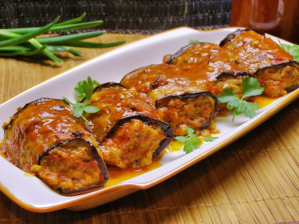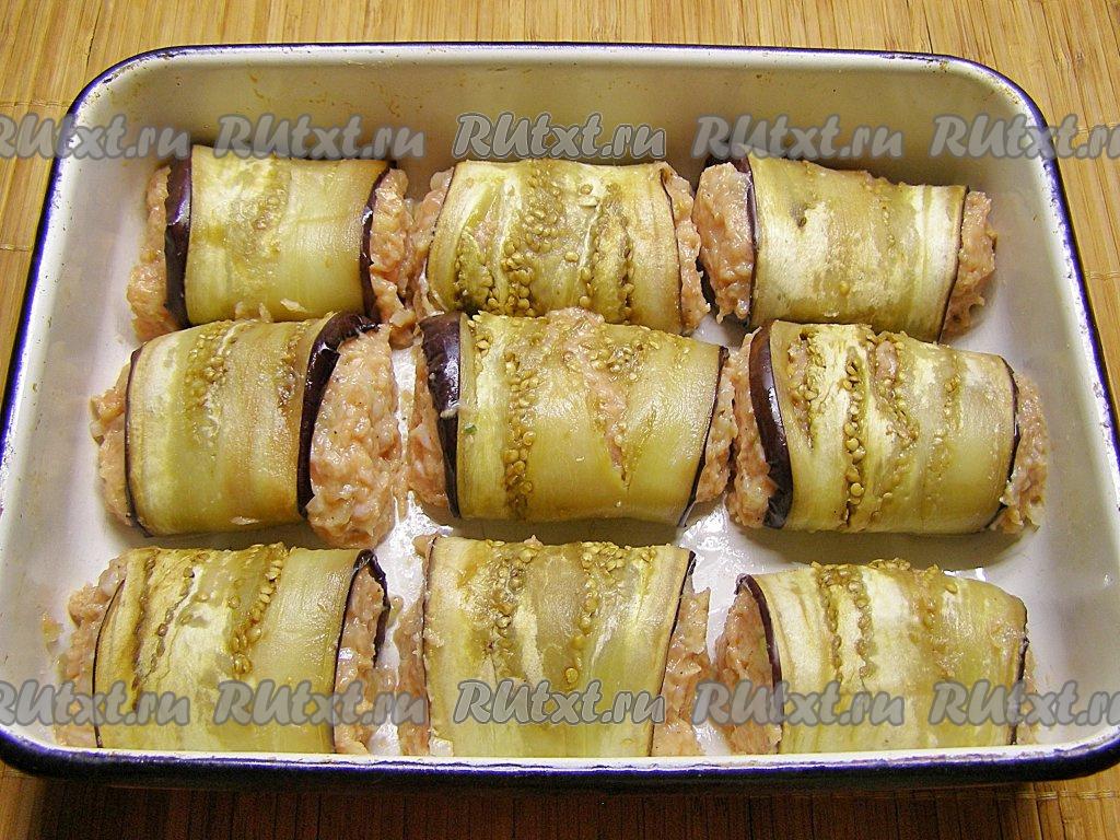 Рулетики из баклажанов с фаршем, запечённые в духовке, - очень вкусное, нежное сытное блюдо. Подать такие рулетики к столу можно в горячем виде, дополнив, по желанию, любимым гарниром. Ну а в остывшем виде они могут стать отличной холодной закуской. Баклажаны прекрасно сочетаются с мясным фаршем, а томатный соус с чесноком и приправами, в котором запекаются рулетики, очень хорошо подчёркивают вкус блюда. Фарш можно взять любой (например, из говядины и свинины, курицы или индейки). Баклажан лучше выбрать крупный, чуть больше среднего, тогда из него получатся отличные пластинки, которые будет удобно сворачивать в рулеты. Приготовьте вкусные, нежные и ароматные рулетики и они обязательно понравятся всей семье!