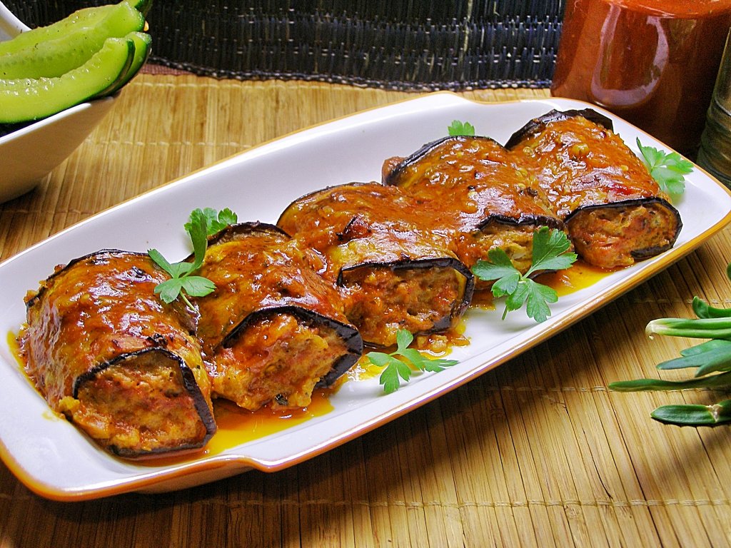 Сочные, ароматные и необыкновенно вкусные рулетики из баклажанов с фаршем достаём из духовки, подаём к столу в горячем виде, по желанию, их можно посыпать свежей зеленью.