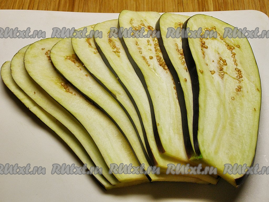 Баклажан хорошо моем, просушиваем от воды, отрезаем плодоножку и нарезаем на тонкие пластинки толщиной около 2 миллиметров (у меня получилось 9 пластинок, соответственно я в дальнейшем формировала 9 рулетиков).