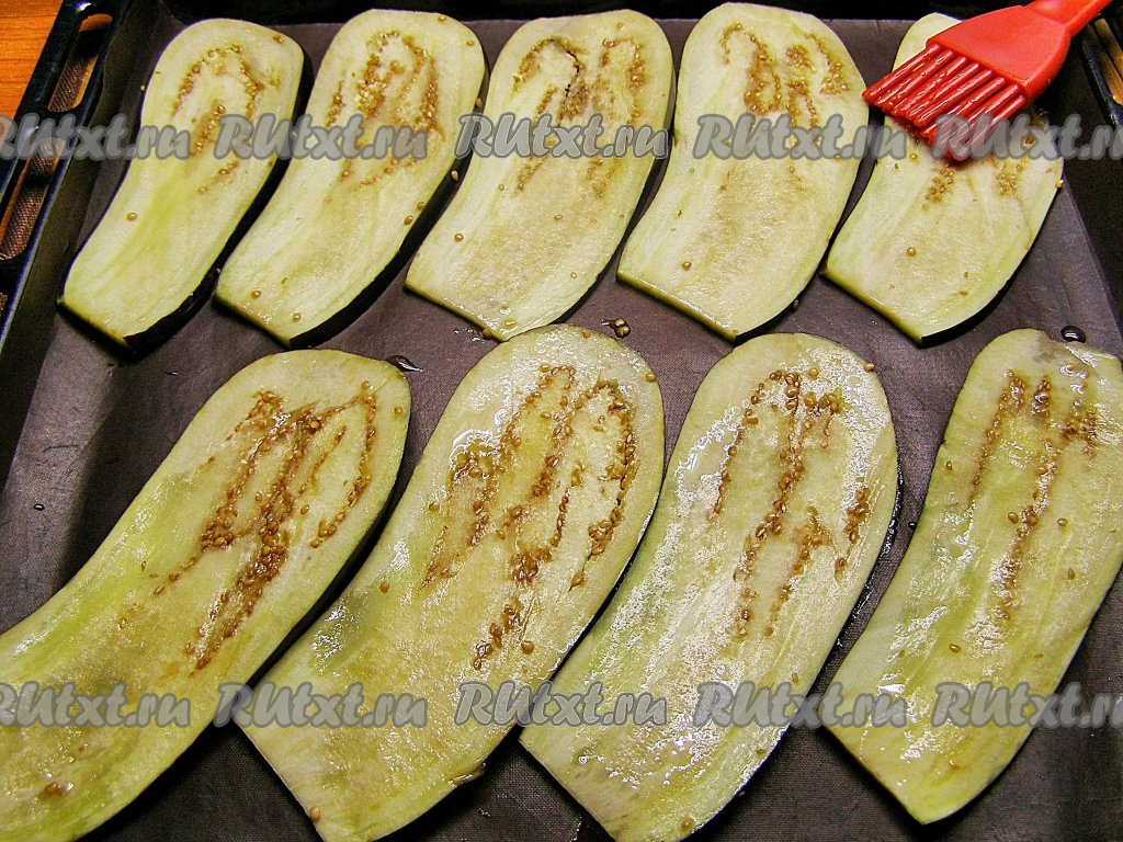 Перекладываем нарезанные пластинки баклажана на противень, застеленный ковриком для выпечки (или пергаментом). С помощью силиконовой кисти смазываем баклажаны растительным маслом и ставим в прогретую до 170 градусов духовку минут на 15 (баклажаны должны стать достаточно мягкими). По истечении времени достаём баклажаны из духовки и оставляем остывать.