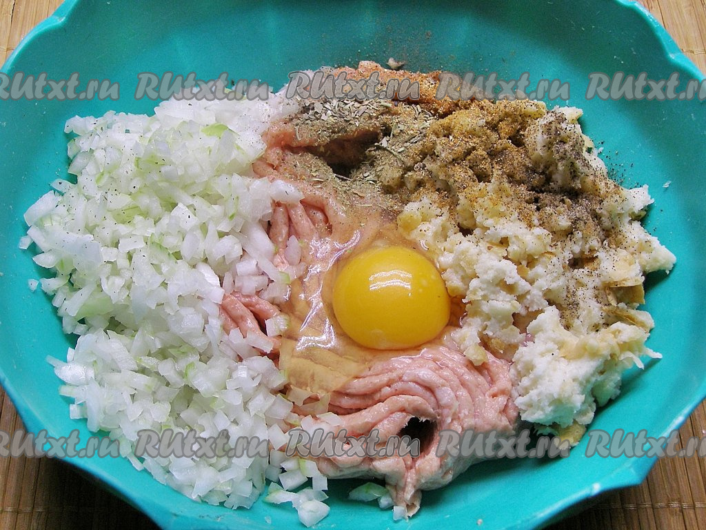 Кусочки мяса пропускаем через мясорубку (можно взять и покупной фарш), перекладываем в миску, добавляем пропущенную через мясорубку (или мелко нарезанную) луковицу. Белый хлеб замачиваем в воде, отжимаем от лишней жидкости, а затем перекладываем к фаршу с луком. Сюда же добавляем яйцо, сушёную зелень, солим и перчим. Перемешиваем фарш руками до получения однородной консистенции.