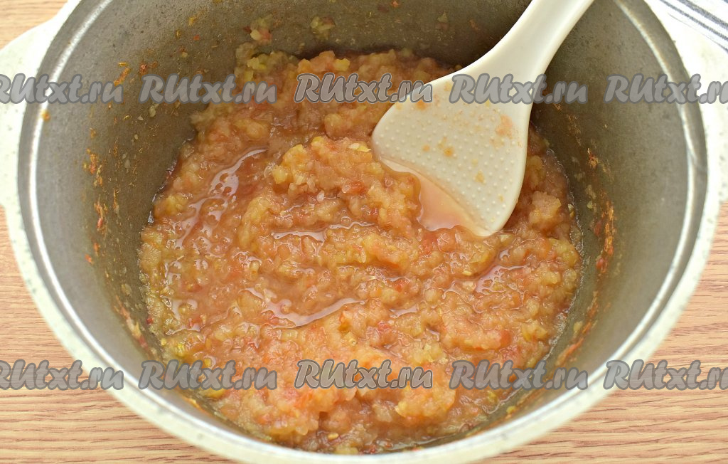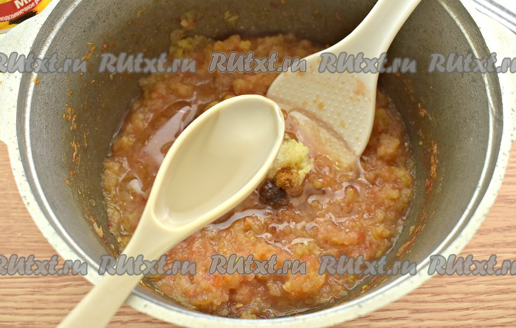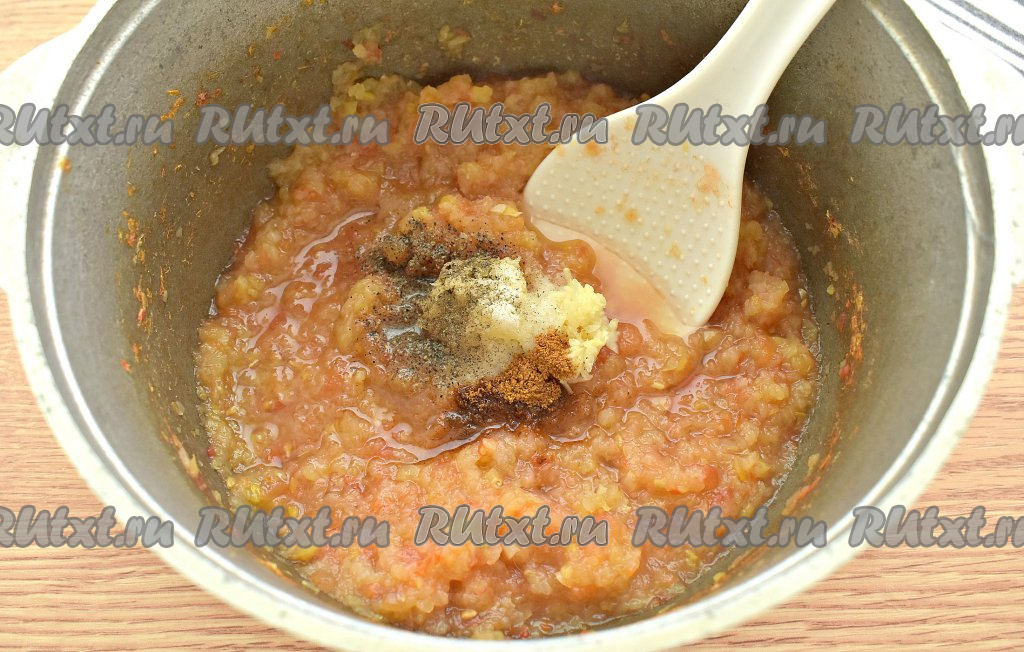 Спустя это время в овощную массу добавляем измельчённый на маленькой тёрке чеснок, всыпаем чёрный и красный молотые перцы, соль.