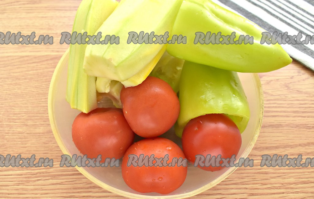 Промываем помидоры, вырезая плодоножку. Очищаем от семян болгарский перец, ополаскиваем. С кабачков срезаем кожуру. Если семечки в кабачке крупные, их тоже нужно удалить.