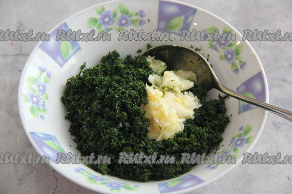 Измельчённый укроп переложить в тарелку. Зубчики чеснока пропустить через пресс (или натереть на мелкой тёрке). Лимон вымыть и снять с него цедру, не затрагивая белый слой, находящийся под жёлтым слоем цедры. Добавить к измельчённому укропу 1,5 столовых ложки растительного масла, 1 чайную ложку цедры, половину чайной ложки соли и измельчённый чеснок, хорошо перемешать.