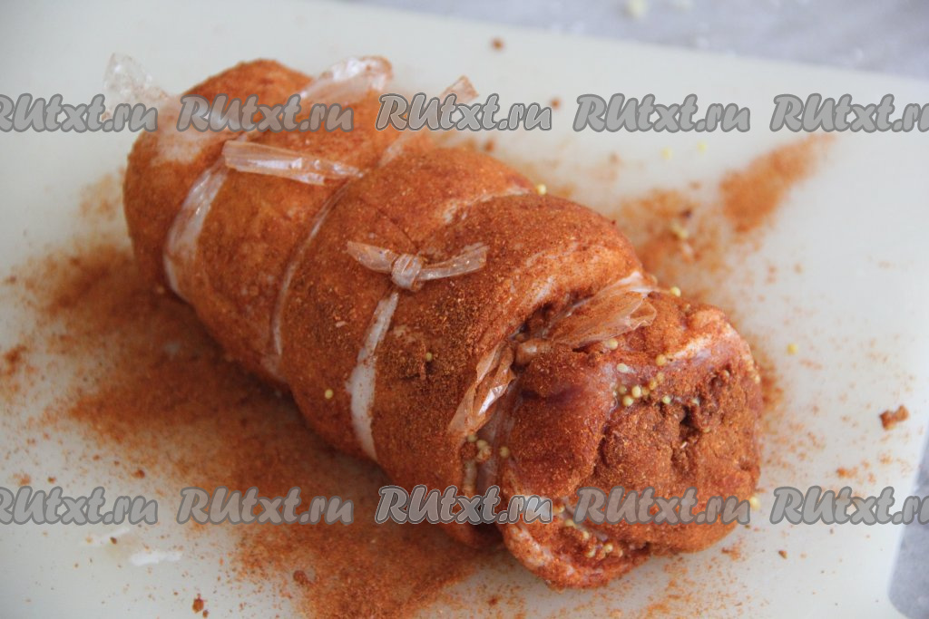 Для того, чтобы рулет не развернулся, перевязать его полосками от пакета для запекания (или шпагатом).