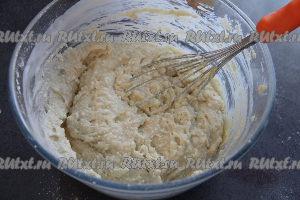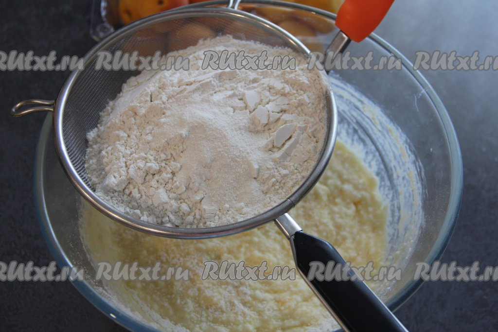 В получившуюся массу всыпать разрыхлитель, частями начать просеивать муку, тщательно перемешивая тесто венчиком.