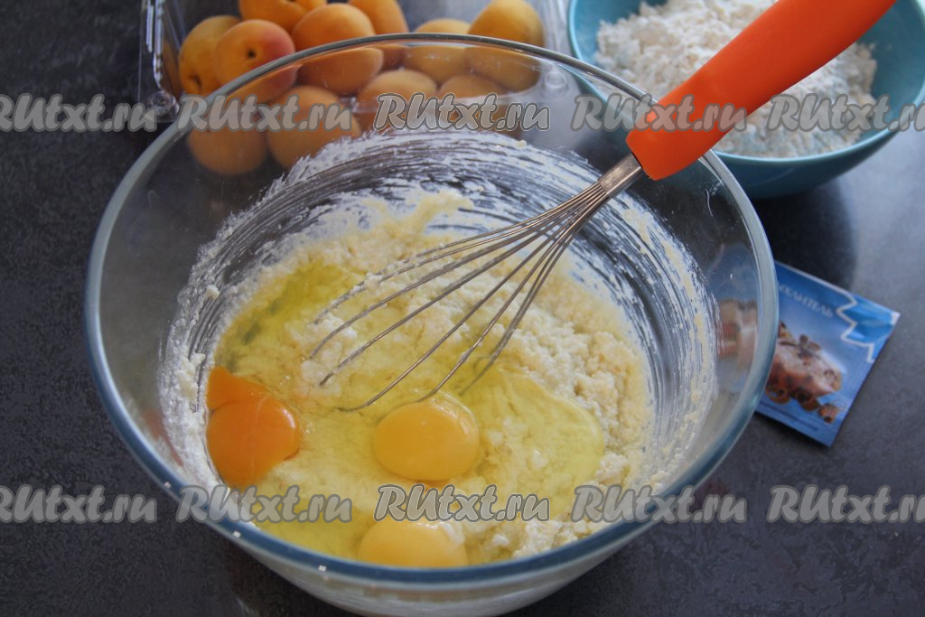Форму для выпечки застелить пергаментом (я выпекала пирог в форме диаметром 25 сантиметров). Выложить тесто в форму. Абрикосы разделить на две половинки и удалить косточки. Выложить половинки абрикосов поверх теста срезом вниз и слегка их вдавить в тесто.