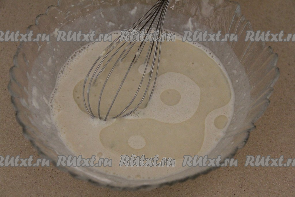Добавить растительное масло и перемешать. Тесто для луковых блинов получается жидким. Оставить тесто отдохнуть на 10 минут.