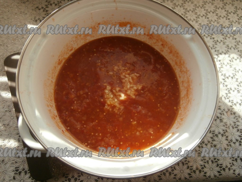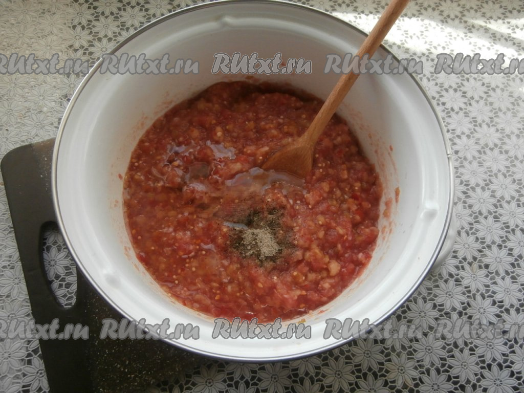 Сюда же всыпать сахар, перемешать яблочно-овощную смесь. Поставить кастрюлю на средний огонь, а после закипания варить аджику на небольшом огне под прикрытой крышкой 30 минут, периодически её нужно перемешивать.