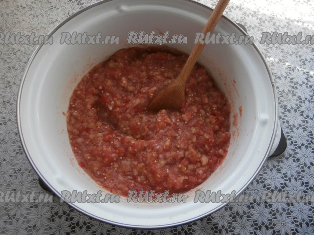 Нарезанные яблоки и овощи пропустить через мясорубку в кастрюлю, в которой планируете варить аджику.