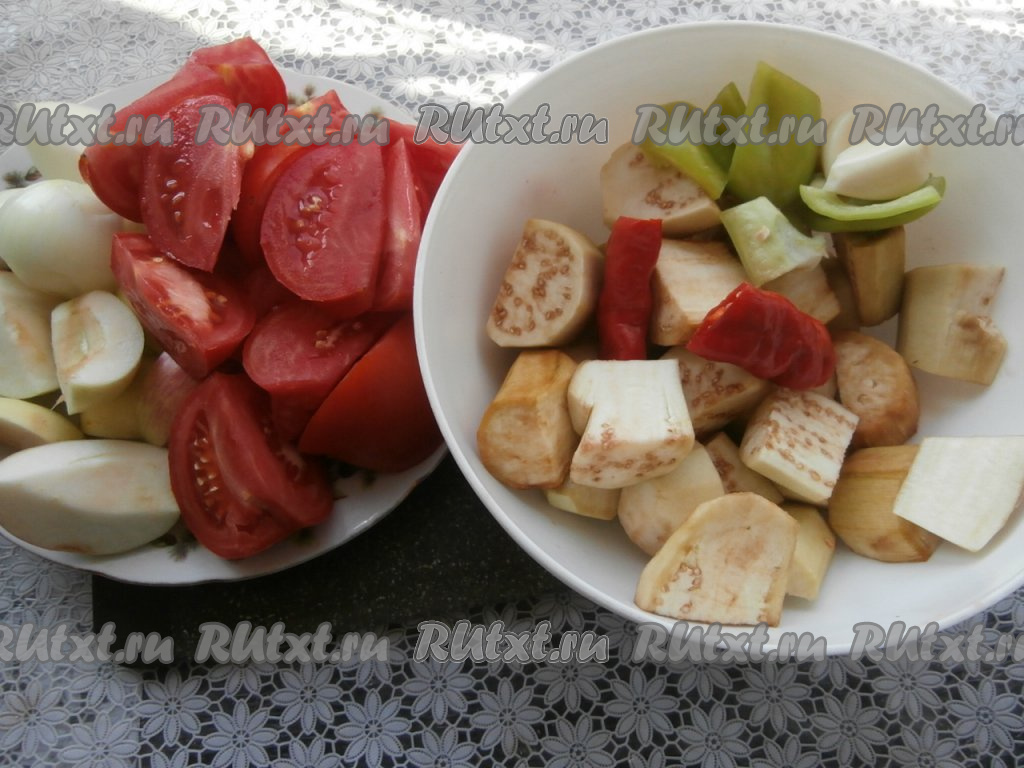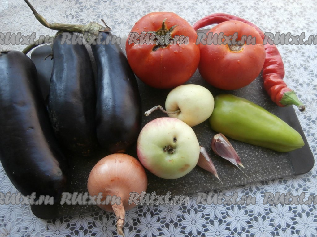 Баклажаны очистить от кожицы. Из яблок, болгарского и горького перцев удалить семена, промыть. Лук очистить. Вымыть помидоры. Баклажаны, перцы, яблоки, помидоры и лук нарезать достаточно крупно.