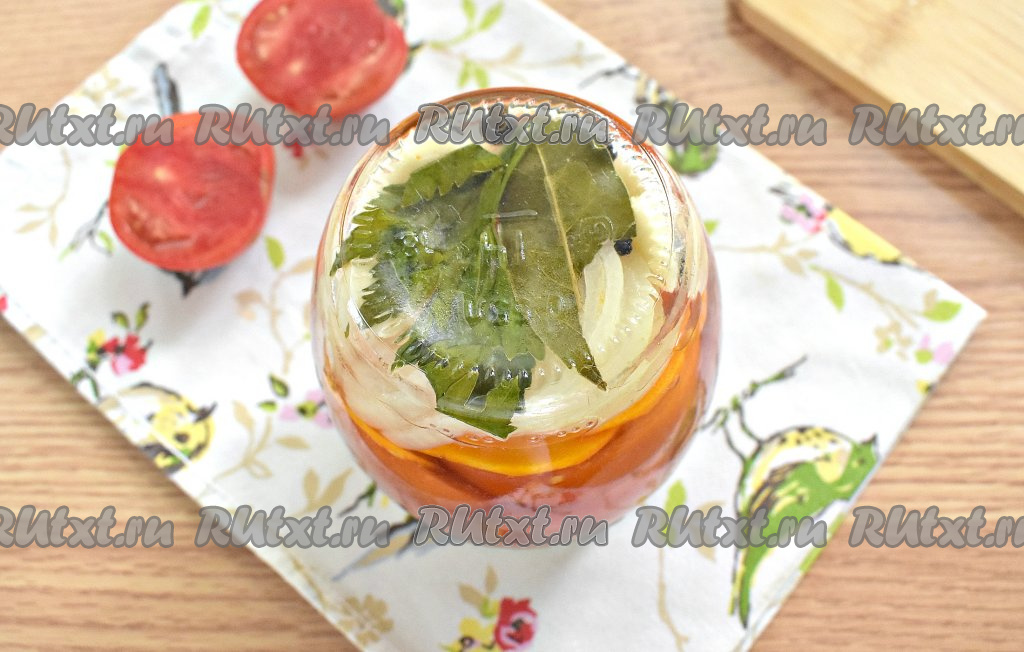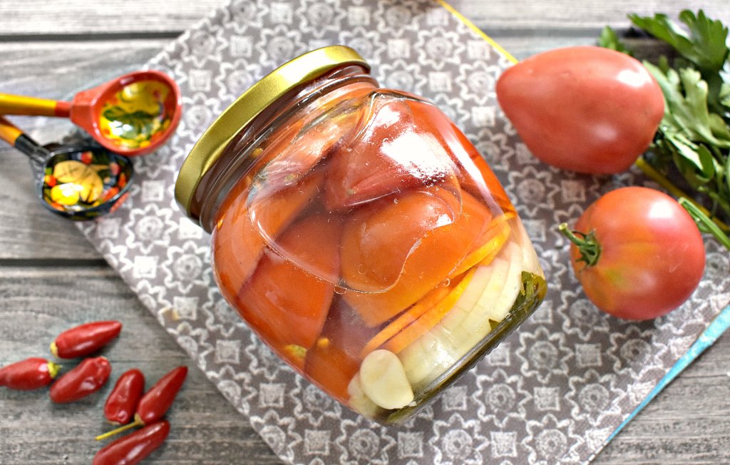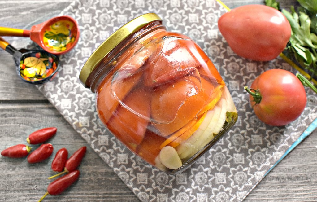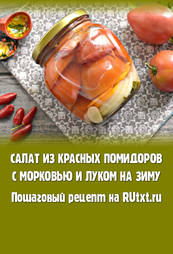 Аппетитный салат, приготовленный из красных помидоров с морковью и луком, зимой порадует вас своим пикантным вкусом.