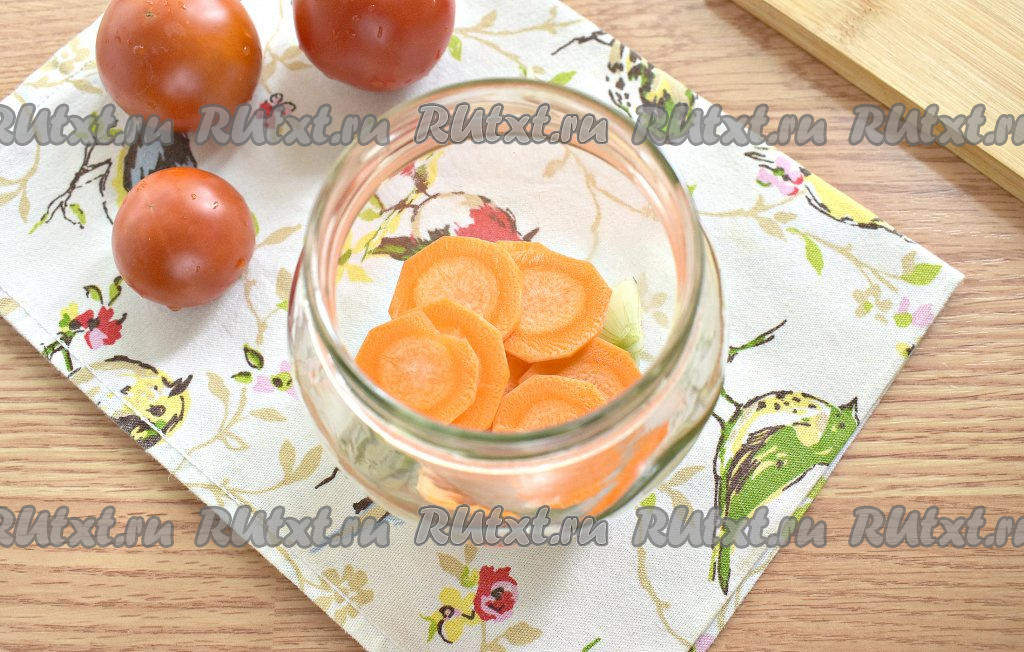 Очищаем морковку, нарезаем на тонкие кружочки, равномерно распределяем по банкам.