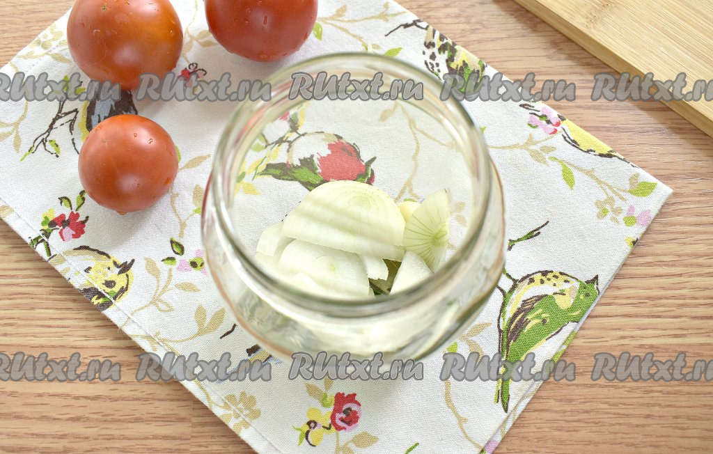 Очищаем лук, нарезаем его полукольцами (или кольцами), равномерно раскладываем по баночкам.