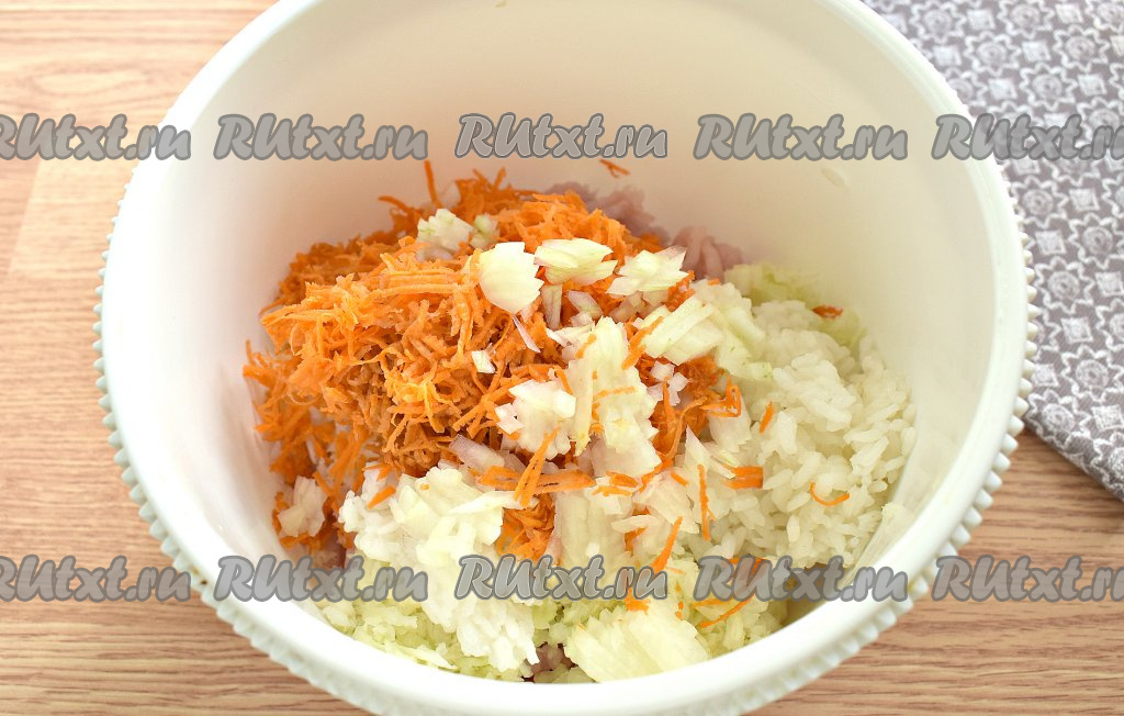 Очищаем морковку и лук. В миску с фаршем, капустой и рисом добавляем натёртую на средней (или мелкой) тёрке морковь и достаточно мелко нарезанный лук.