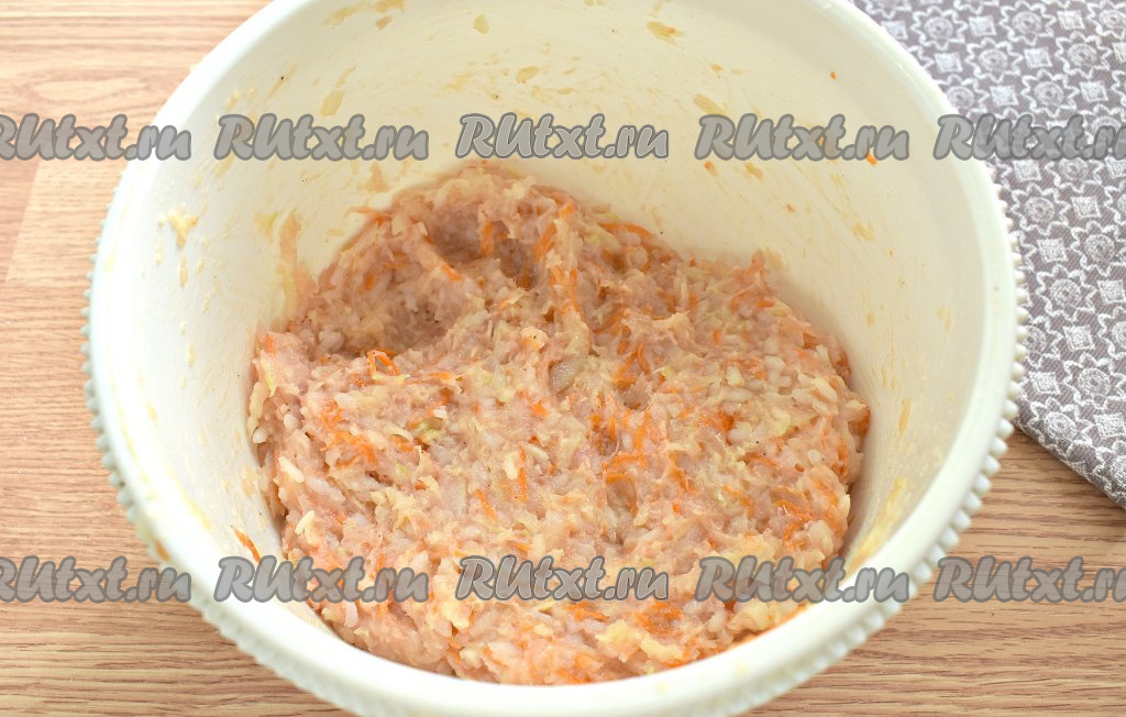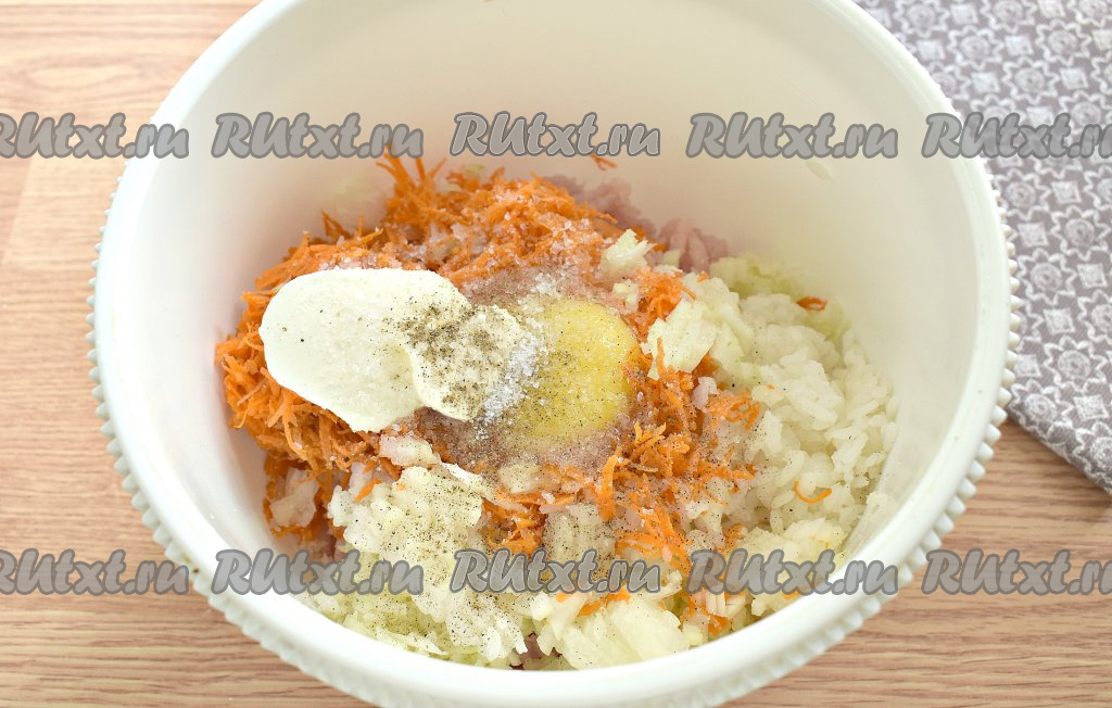 Тщательно перемешиваем фарш с рисом и овощами, в результате получится в меру вязкая масса.
