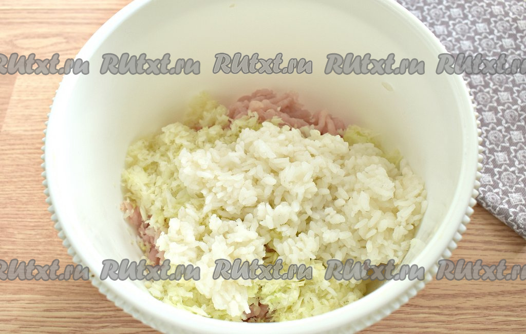Рис промываем, выкладываем в кастрюлю с достаточно большим количеством кипящей подсоленной воды и отвариваем после закипания на небольшом огне в течение 15 минут, затем перекладываем на сито, ополаскиваем холодной водой, даём полностью стечь воде. Добавляем рис в миску с фаршем и капустой.