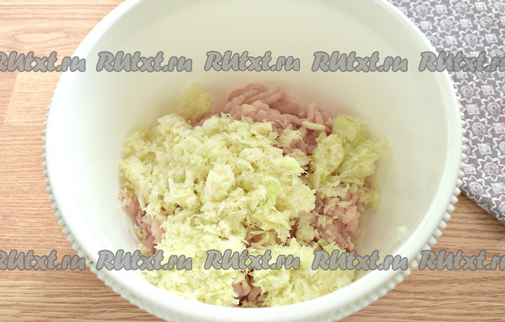 Капусту нарезаем на мелкие кубики (или натираем на крупной тёрке), перекладываем в отдельную миску, заливаем кипятком и оставляем так на 10 минут. Затем капусту хорошо отжимаем от воды и перекладываем к фаршу.