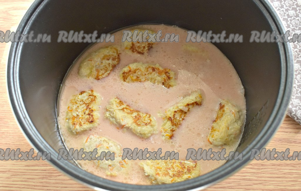 Из получившейся массы формируем продолговатые овальные заготовки голубцов. У меня получилось 10 штук. Включаем мультиварку на режим "Жарка", вливаем в неё растительное масло. Когда масло прогреется, выкладываем заготовки голубцов и обжариваем их, не закрывая крышку, по 5-6 минут с каждой стороны.