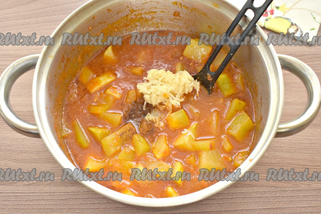 Спустя 20 минут варки в закуску из кабачков, перцев и помидоров добавляем пропущенный через пресс (или натёртый на мелкой тёрке) чеснок, всыпаем красный молотый перец, перемешиваем, варим ещё 5 минут.