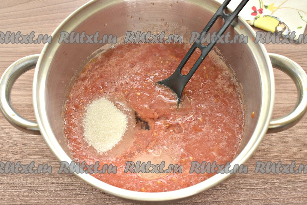 Получившуюся смесь из помидоров и перца перекладываем в кастрюлю, в которой будете варить закуску, затем всыпаем сахар, соль, вливаем растительное масло, перемешиваем и ставим на средний огонь. После закипания убавляем огонь и варим томатную массу 10 минут, иногда помешивая.