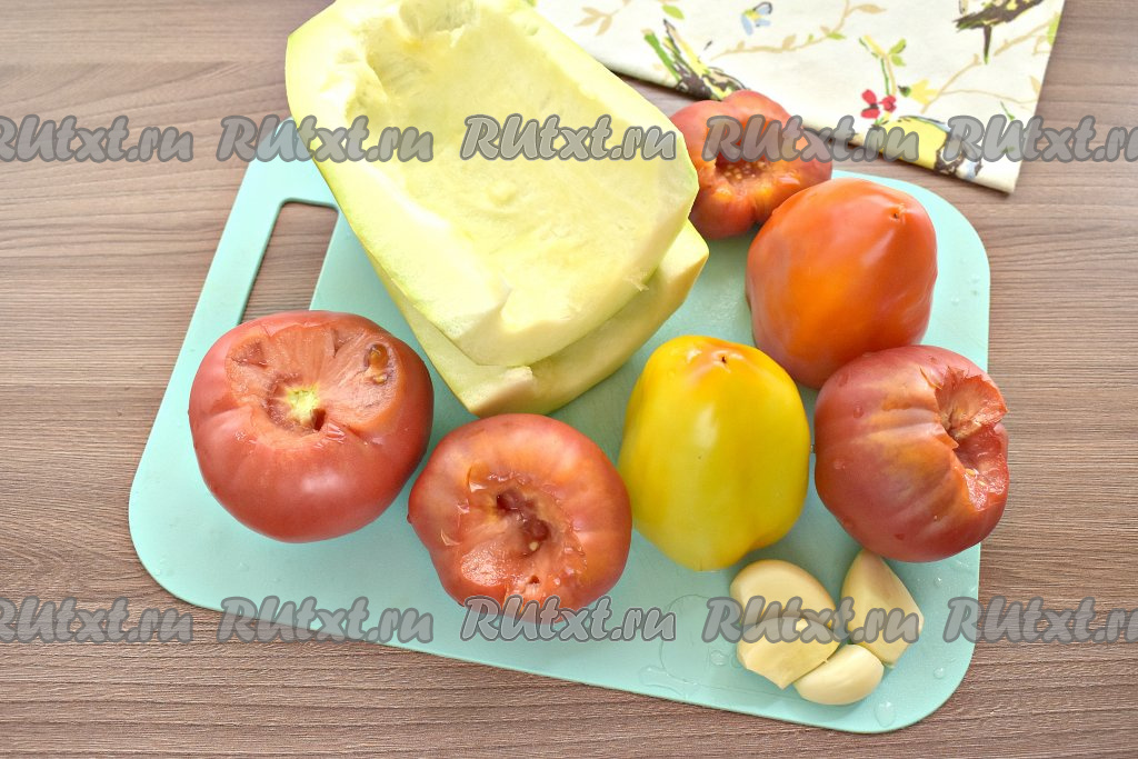 Очищаем кабачки от кожуры, удаляем семечки (если кожица тонкая и семечки мелкие, тогда кабачки можно готовить с кожурой). У помидоров вырезаем место, в котором находилась плодоножка. Перцы очищаем от семян, промываем. Очищаем зубчики чеснока. Взвешиваем подготовленные овощи, напоминаю, что в ингредиентах указан вес овощей в очищенном виде.