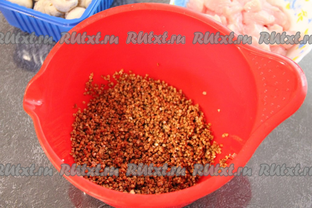 Гречку тщательно промыть, убирая испорченные зёрна, затем слить лишнюю воду.