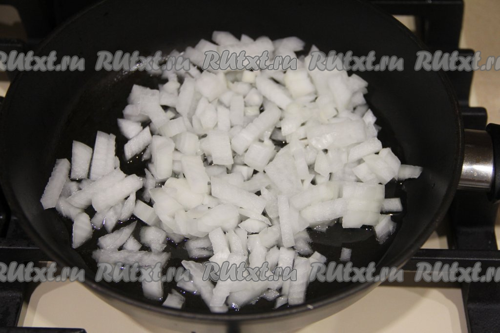 В сковороде прогреть растительное масло, после этого выложить мелко нарезанную луковицу и обжарить её на умеренном огне, иногда помешивая, до прозрачности (обычно на это требуется минуты 3-4).