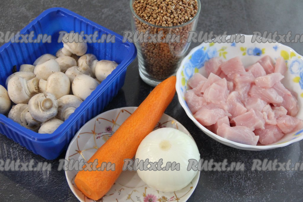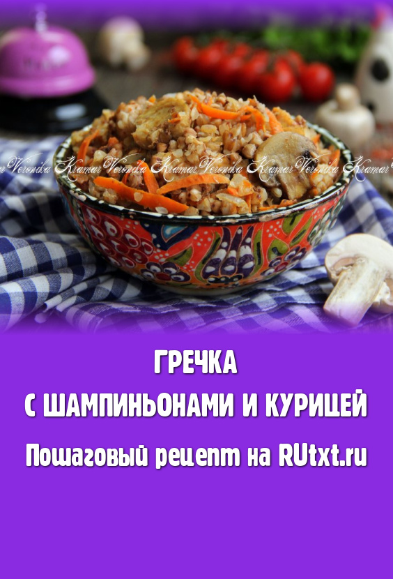 Выложить гречку с курицей и шампиньонами в жаропрочную форму.