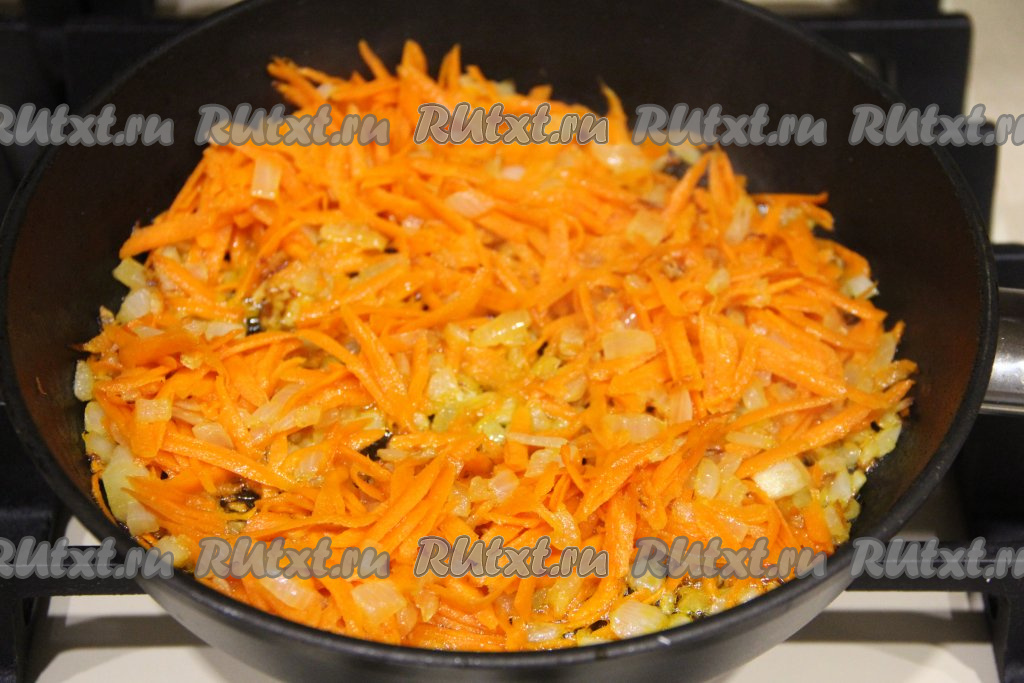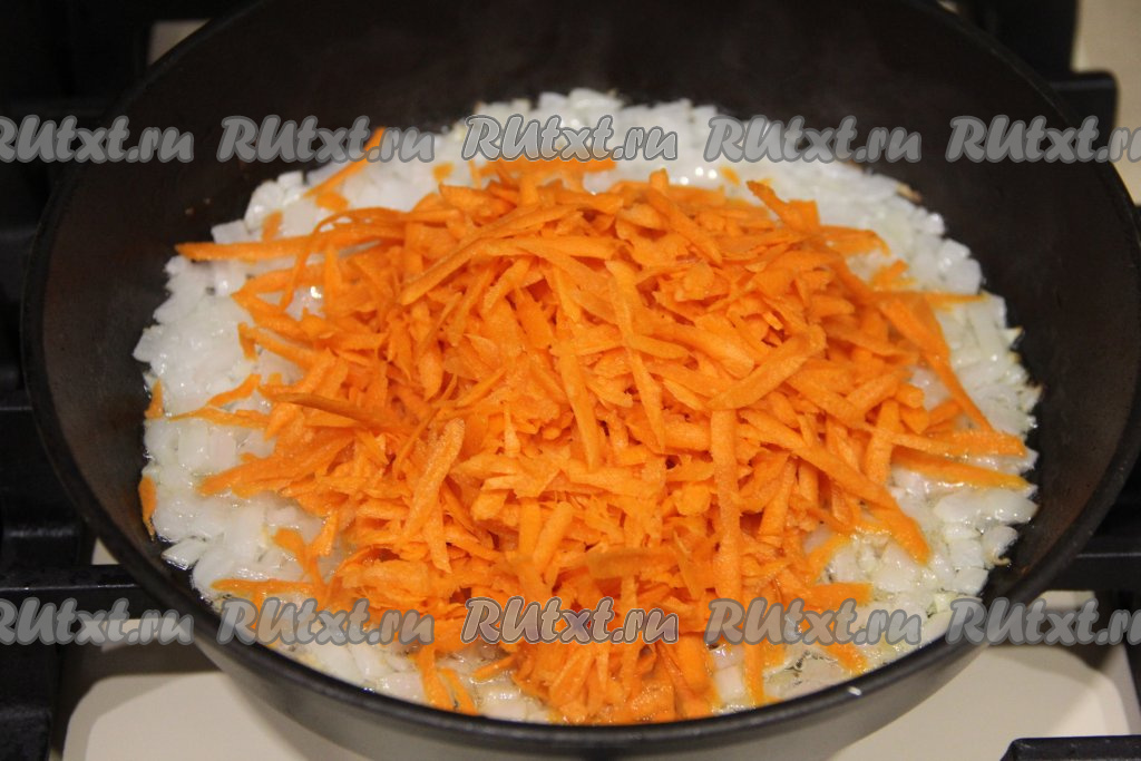 Когда лук станет прозрачным, добавить к нему натёртую на крупной тёрке морковку.