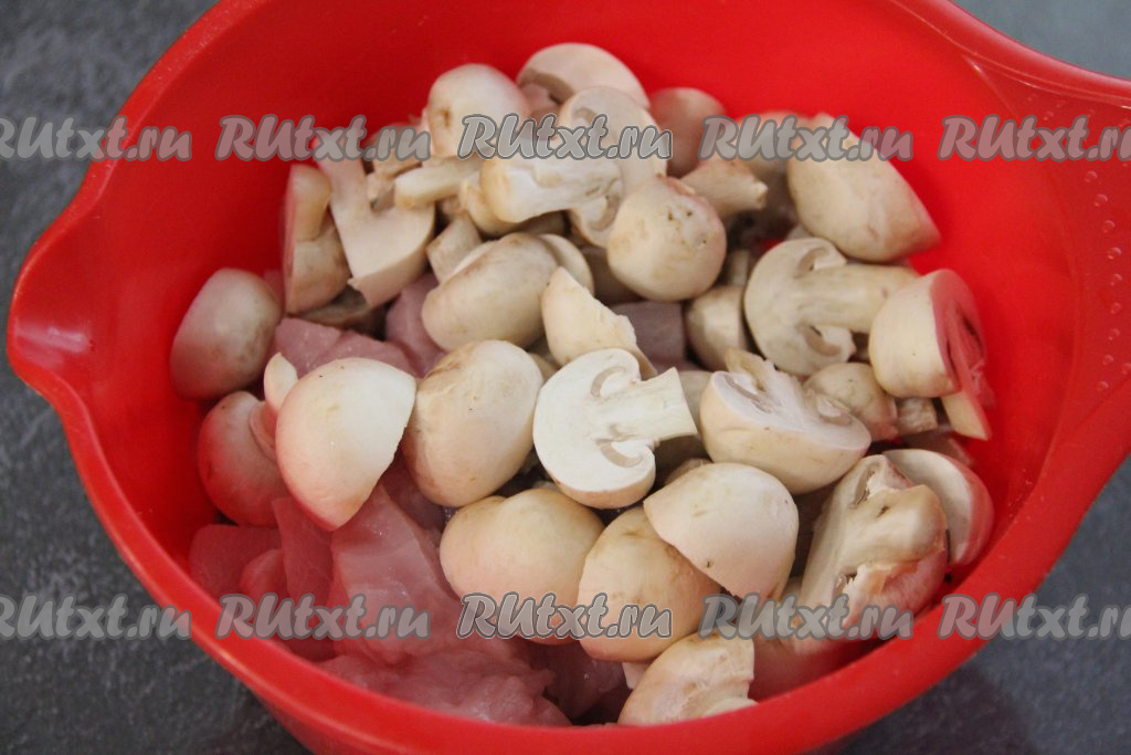 К гречке и курице добавить шампиньоны, разрезанные пополам.