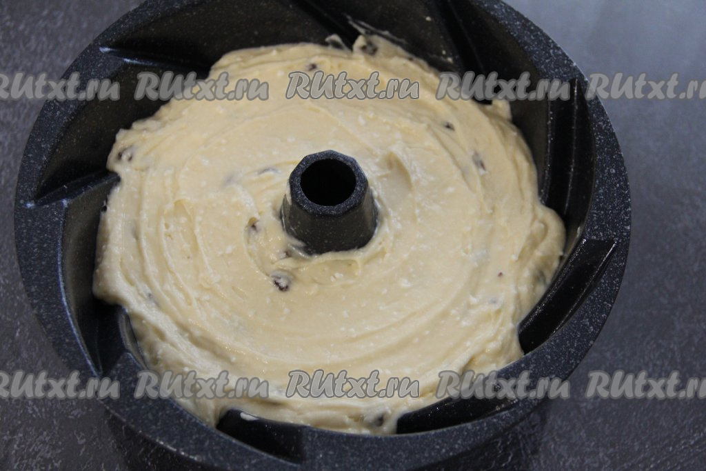 В форму для выпечки (я взяла литую форму для выпечки диаметром 22 сантиметра, её, как и силиконовую форму, предварительно можно не смазывать маслом, все остальные виды форм лучше смазывать маслом) выложить тесто, заполняя форму на 2/3 объёма.