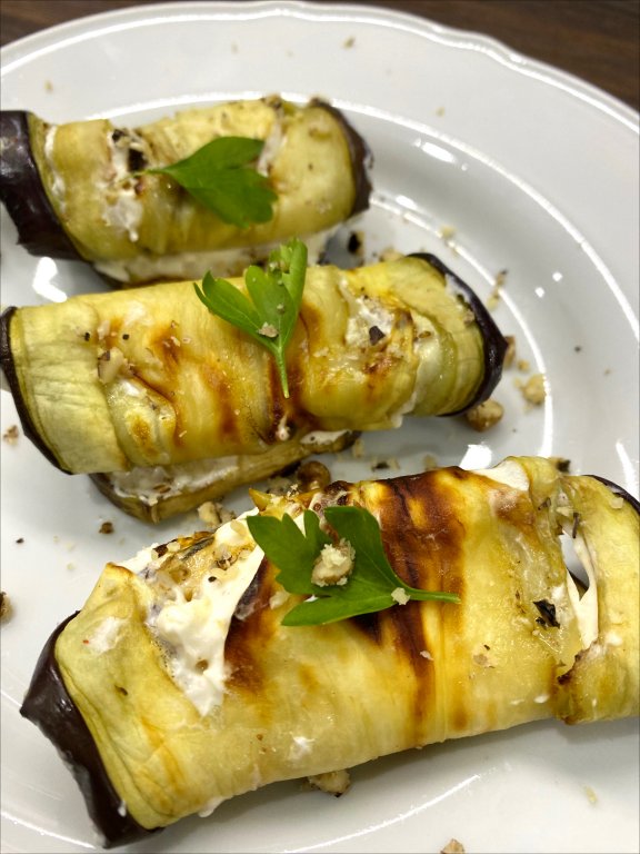 Очень вкусные, сочные рулетики из баклажанов с начинкой из творожного сыра и помидора выложить на тарелку и подать к столу.
