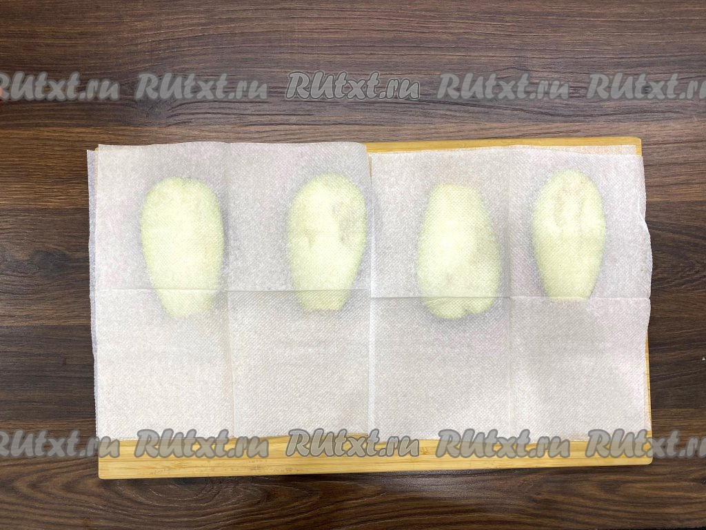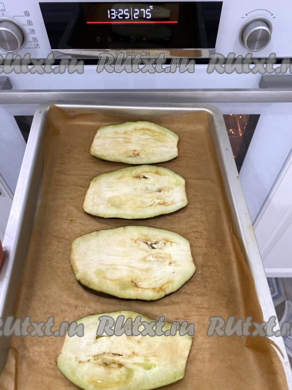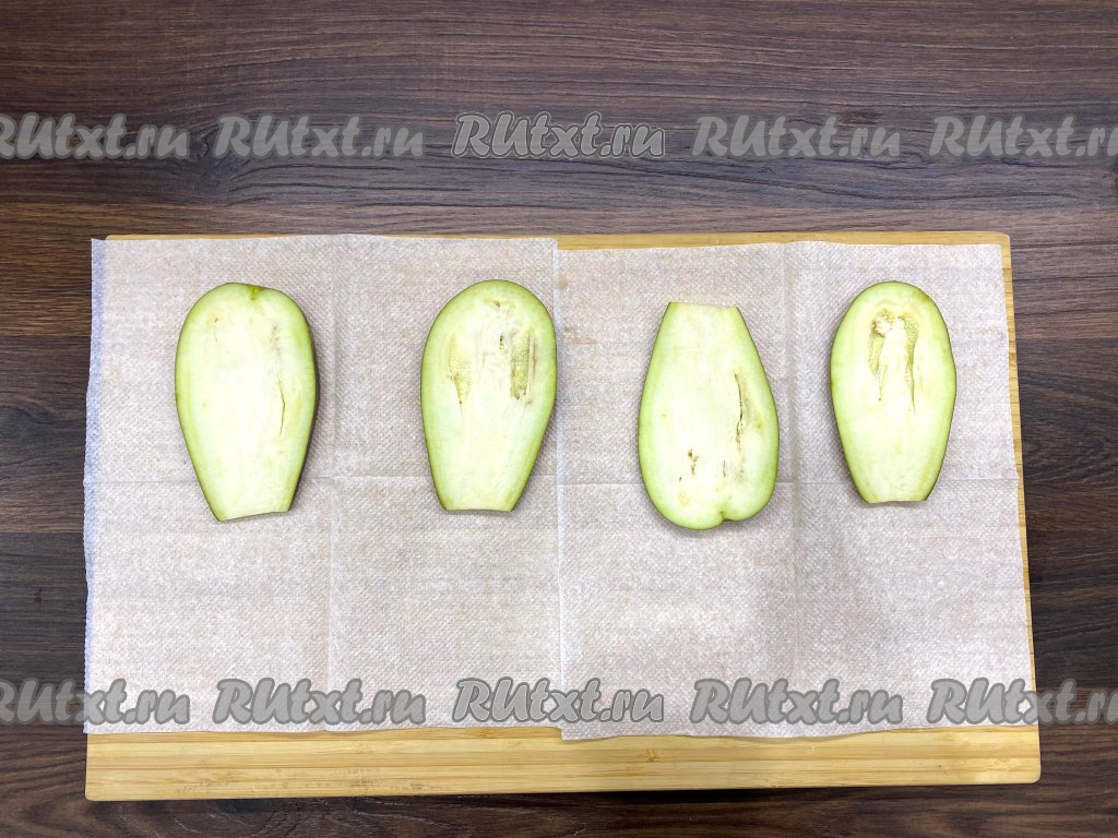Оставить посоленные баклажаны минут на 10, затем промокнуть бумажным полотенцем, убирая выделившуюся жидкость. Включить духовку, выставить температуру 200 градусов.
